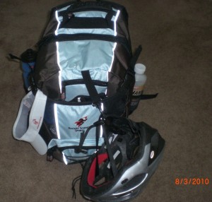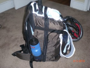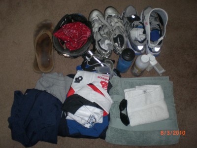 As with the Real Joe/Real Jane bag, we used the same amount of gear that we normally carry to an event. This includes: Two pairs of shoes, helmet, change of clothes, tri top, bike jersey, warmups, towels, change of clothes, nutrition, visor, socks, and probably a few other things thrown in for good measure. Here’s all the gear: