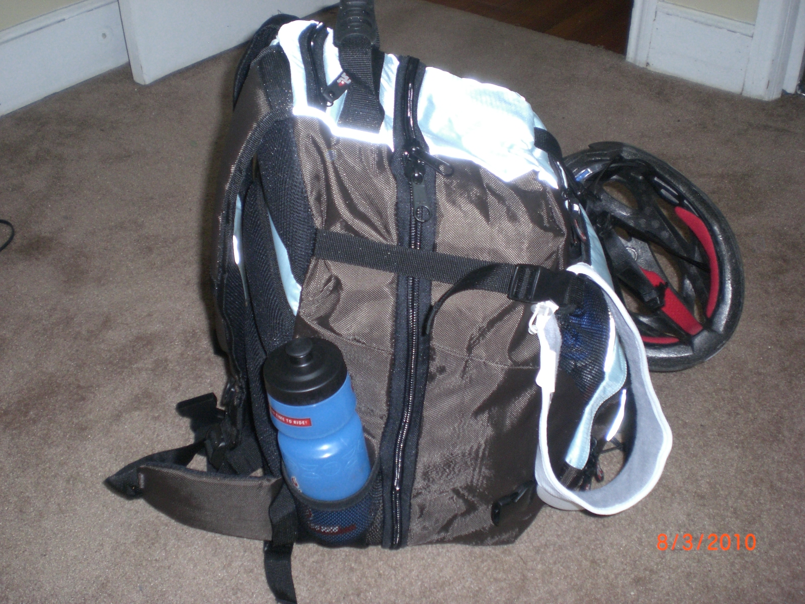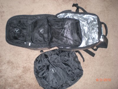 As you can see, the bag is straining a bit. Everything fit and there’s a bit of room left to add a few more things, but you can see the helmet hanging from the bag. With the Real Joe/Real Jane bag, everything fit inside the bag, including the helmet in the helmet holder.